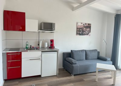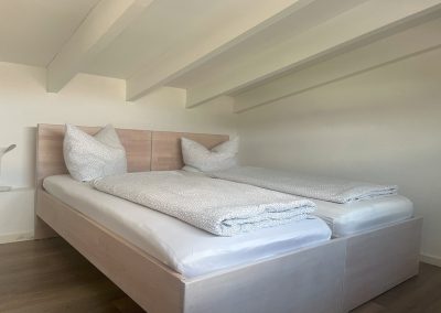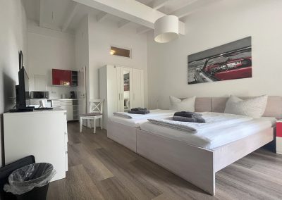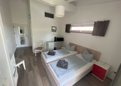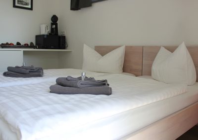 Unsere modern eingerichteten Zimmer und Apartments sind alle ausgestattet mit Doppelbett, TV, Kühlschrank, Kaffeemaschine, Mikrowelle und Wasserkocher. Die 2 Apartments verfügen zusätzlich über eine kleine Küchenzeile. Die Doppelbetten lassen sich bei Bedarf auch als Einzelbetten stellen.