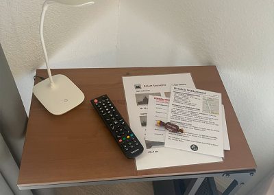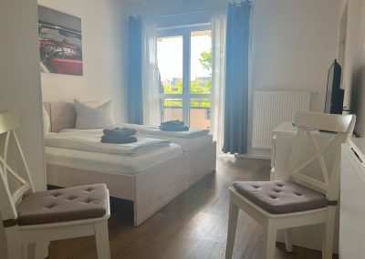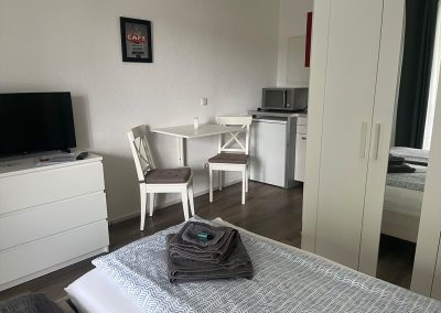 Doppelbett, TV, WC/Dusche, Miniküche (Kühlschrank, Kaffeemaschine, Wasserkocher, Geschirr, Besteck, Mikrowelle in Zimmer 1+3)